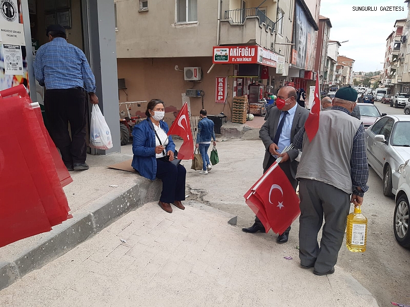 CHP İlçe Başkanı Ali Erayhan ve yönetim kurulu üyeleri ilçe de vatandaş ve esnaflara Türk Bayrağı dağıttı. Başkan Erayhan ve beraberindekiler, ilçede kurulan Perşembe pazarı ve kentin belirli noktalarında yaptıkları etkinlik kapsamında vatandaşlara bayrak hediye ettiler.
