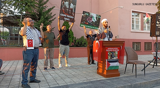 Kerim Mandıralıoğlu, konuşmasında şu ifadeleri kullandı, “Bugün işgalci Siyonistlerce çoluk çocuk, kadın yaşlı demeden kanı akıtılan 40 bin şehidin, on binlerce yaralının acısını yüreğimizde taşıdığımızı göstermek için buradayız. Bugün, parçalanmış, korkutulmuş ümmetin yüz akları olan Şeyh Ahmet Yasin’e, Abdülaziz Rantisi’ye son olarak: üç oğlu ve iki torununun şehit olduğu haberi verilince: “Oğullarımın kanı Gazze’deki şehit halkımızın kanından daha kıymetli değildir. Çocuklarım, Kudüs’ün ve Mescid-i Aksa’nın kurtuluşu uğruna canlarını feda etti” sözleriyle yiğitliğini gösteren İsmail Haniyye'yi anmak için buradayız. O ve diğerlerinin onurlu mücadeleleri tarih sahnesinde destana dönüşecek inşallah. Hz. İbrahim’in ateşini söndürmeye koşan karınca misali, en azından safımızın belli olması için Filistin’in haklı davasına dualarımızla destek vermemiz İslami, insani ve vicdani sorumluluklarımızdandır. Karşımızda Müslüman coğrafyaya saplanmış bir hançer konumundaki 'Terör devleti’ olan bir İsrail var. Her türlü alçaklığı, barbarlığı ideoloji edinmiş, Siyonist bir musibet var. Müslüman coğrafyanın baş belası, savaşın asıl sahibi ABD var. Bu şer güçlerin karşısında da onlarca Müslüman Devletin yapamadığını yapan ümmetin yüzakı bir avuç Filistin şanlı direnişi var. “Utan ey ümmeti merhume! çığlığına: "Hayat iman ve cihaddır.’’ prensibine yapışan şanlı Gazze direnişine selam olsun. Vicdanlı dünya insanlarını hayran bırakan Gazze direnişi ümit var olmamızı tembihliyor. Gazze ruhu, ölü toprağı serpilmiş İslam alemini diriltmeye devam ediyor. Haksızlık karşısında Hakkı haykıracak, ayağa kalkacak, Hakka şahitliğini sürdürecek bir ümmet bilincine ulaşmamıza katkı sağlıyor. Bunun için ise yüreklerimizi işgal eden dünyalık ağırlıklarımızdan kurtulmamız gerek. Unutmayalım ki, aşağılanmayı, ezilmeyi, sömürülmeyi alın yazısı gören bir ümmet asla ayağa kalkamaz. Peygamberler şehri, ilk kıblemiz Kudüsü, Mescidi Aksâ’yı zalimlerin eline bırakma Ya Rabbi! Bizleri basiretsizlerden, vicdansızlardan, zalimlerden yana eyleme Ya Rabbi! Ümmet-i Muhammed’in hâlini ıslâh eyle Ya Rabbi! Ümmet-i Muhammed’i bir araya getir, birlik ve beraberlik nasip eyle Ya Rabbi! Firavunları, Nemrutları, Karunları, Ebu Cehilleri, Ebu Lehepleri perişan ettiğin gibi günümüzdeki temsilcilerini de perişan eyle Ya Rabbi!”