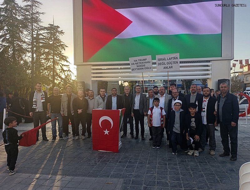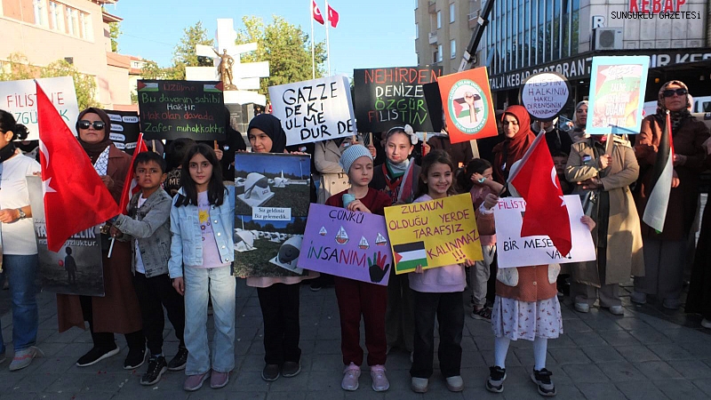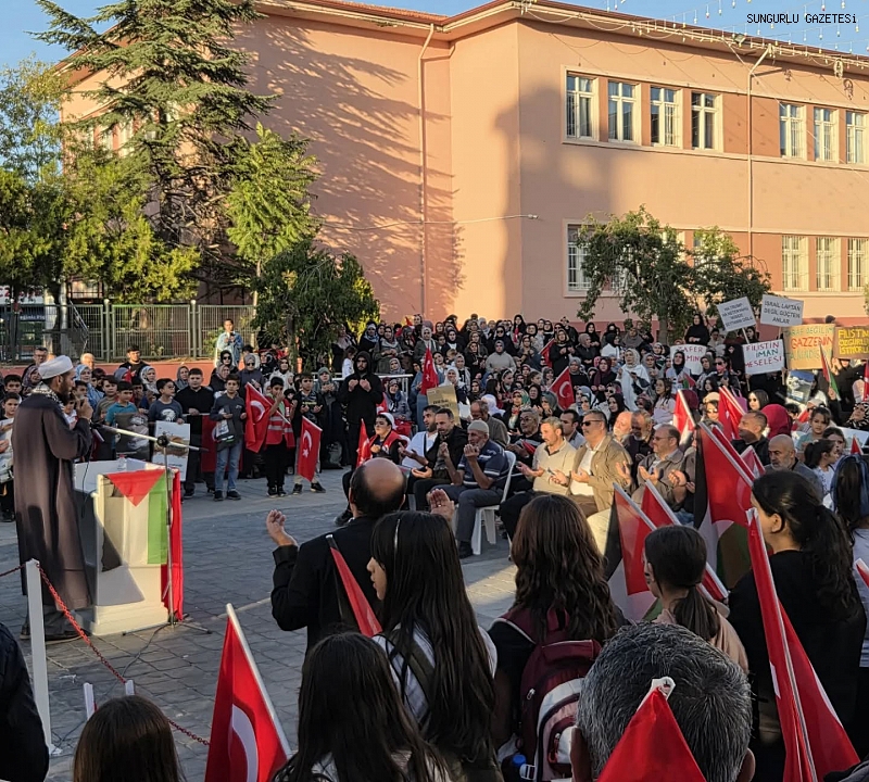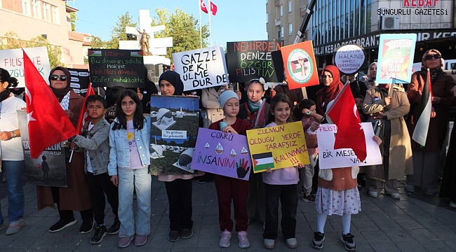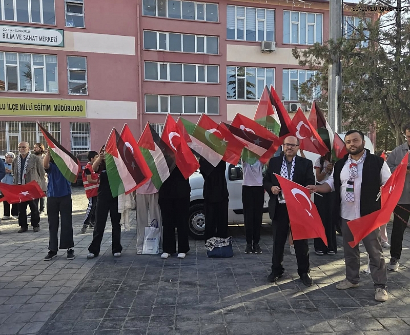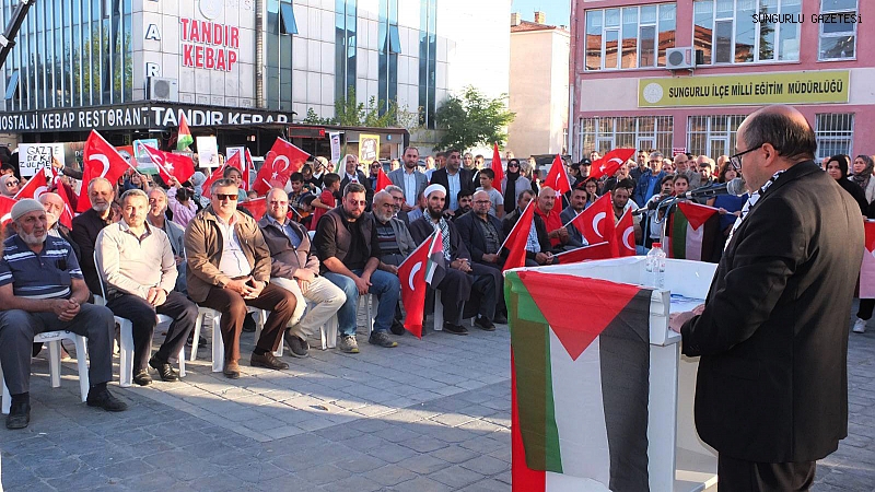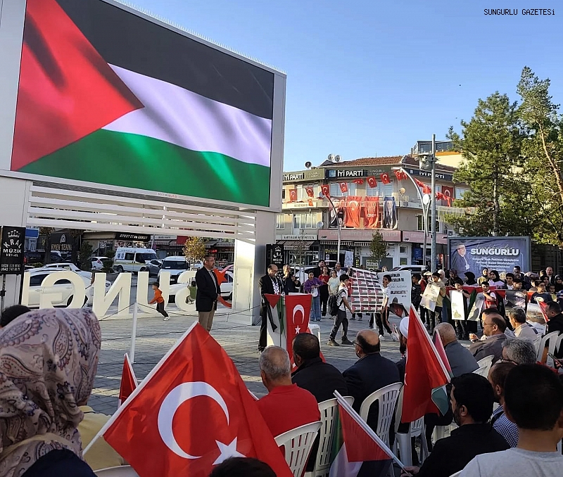 Atatürk meydanında bir araya gelen vatandaşlar Filistin’e destek, İsrail’e tepki gösterdi. Kur'an Kerim tilaveti ve duaların yapıldığı programda konuşan Kızılay Sungurlu Şube Başkanı Kerim Mandıralıoğlu şunları ifade etti, “Zulümle, soykırımla, merhametsizlikle kirlenmiş dünya, iki yılı aşkın süredir eşi benzeri görülmemiş Gazze dramına sahne olmaktadır. Bir tarafta sözden, kınamadan, kanun ve kurallardan anlamayan Siyonist İsrail ve onun arkasındaki büyük şeytan ABD, diğer tarafta evini barkını, çoluk çocuğunu, annesini kardeşini, kısacası her şeyini kaybetmiş mazlum Gazze halkı. Bir diğer tarafta ise olup biteni film izler gibi izleyen milyonlar…
